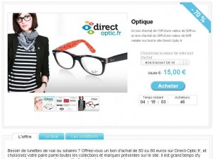 Offre qui peut vous interesser si vous desirez une nouvelle paire de lunette de soleil ou de lunettes de vues : sur groupon , on peut acheter à prix reduit des bons d’achats valables sur le site specialisés Direct Optic.fr