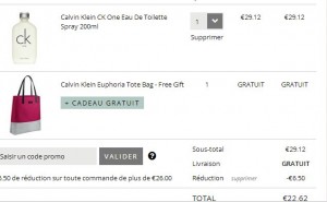 en fait le flacon est en promo à 29.12 euros, quand on le met dans le panier ,ca ajoute un sac en prime … et donc si on passe le code promo le prix descend à 22 euros …