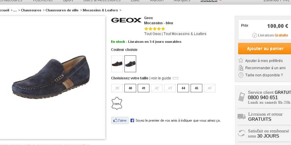 Quand on compare les prix on s’apercoit que ces mocassins pour hommes de couleur bleue en cuir sont à 100 euros sur zalando .. On ne les voit pas vraiment sur d’autres sites , par contre on voit d’autres mocassins geox assez similaires à plus de 100 euros ailleurs également ..