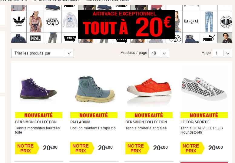 IL y a un arrivage d’articles proposés à 20 euros : on voit les chaussures montantes palladium enfants Pampa, jeans Petrol , chaussures converse , jeans kaporal , japan rags, pepe jeans, polo ben sherman , guess … et bien d’autres