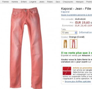 Toujours des bonnes affaires en farfouillant dans les soldes sur amazon : comme par exemple ce jean de la marque Kaporal pour filles à 19.6 euros port inclu .. Jean de couleur orange proposée dans les tailles 8 ,10,12,14 et 16 ans mais avec que quelques exemplaires pour chaque taille ..