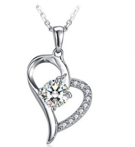 Un collier avec une chaine de 45 cm , et un pendentif en forme de coeur en argent avec des petites pierres sur un coté, ainsi qu’une plus grosse au centre …