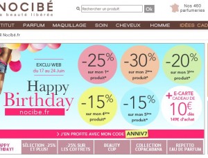 Des bonnes affaires parfums, maquillages peut etre du coté de nocibe … Avec le code promo « ANNIV7 » qui donne differentes remises : 25% sur le premier article, 30% sur le deuxiemes, 20 sur le troisieme et 15 sur les 4eme et 5eme …