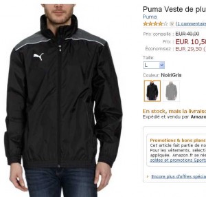 Dans les soldes sur amazon, avec la quatrieme demarque, de nombreux articles de la marque Allemande Puma sont passés à des prix ultra interessants : des tee shirts à moins de 10 euros, des survetements à moins de 10 .. des vestes .. Il y a un peu de tout .. Cependant pour certains articles il ne reste que quelques tailles car ca part tres vite ..