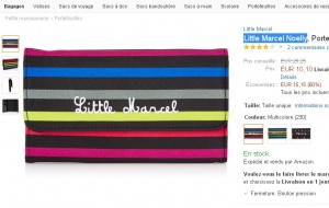 10 euros un portefeuille de la marque Little Marcel … Le modele Noelly en vente sur amazon à ce prix donc …