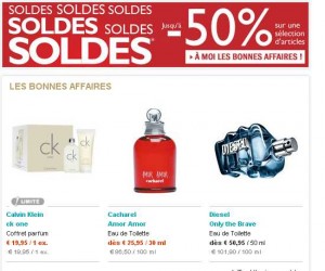 Il y a toujours les soldes sur la parfumerie en ligne douglas , avec toujours de super affaires  : comme le coffret d’eau de toilette ckone à moins de 20 euros (voir ce coffret calvin klein ) , ou encore l’eau de toilette noa de cacharel à moins de 20 euros (voir cette eau de toilette femmes) , ou aussi l’eau de toilette Amor Amor de Cacharel 30ml à 25.95 euros (voir amor amor ) ..