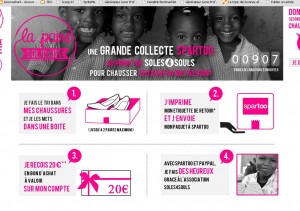 Spartoo propose une collecte de vielles chaussures et en echange donne des bons de réduction … Dans le principe on envoi jusqu’à 2 paires de chaussures avec les frais d’envois prépayés et on recoit un bon de réduction qui sera ensuite à utiliser sur le site …