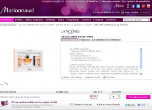 Sur marionnaud, dans les soldes on peut acheter pour 30.50 euros un coffret Tresor de Lancome avec l’eau de parfum 50ml un gel douche, un lait pour le corps et un mascara ..