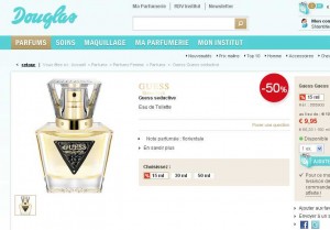 Super affaire parfum sur le site douglas parfumerie .. Les soldes sont finies, mais sur le site il y a le retour de la rubrique prix malins dans laquelle il y a bien souvent de très bonnes remises sur certaines fragrances … Et effectivement on y voit le flacon d’eau de toilette Guess Seductive en vapo de 15ml à 9.95 euros seulement .. Cela represente une remise de 50% quand on sait que l’eau de toilette en 30ml coute generalement autour de 40 euros ( 40.9 euros sur marionnaud et sephora par exemple )..
