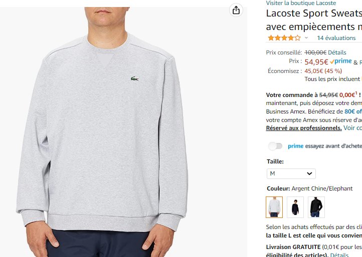 En effet sur Amazon, ce meme sweat Lacoste SH9604 ans la couleur grise bénéficie de 50% de réduction et est affiché à 54.95€