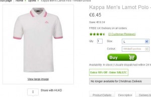 maj 28/12 : le code reduction n’est plus valable mais ce meme polo revient encore moins cher sur le site thehut ou il revient à 5.48 euros port inclu en utilisant le code promo « CLOTHING15 » valable jusqu’au 29/12 .. Cliquez ici pour voir ce polo sur thehut )