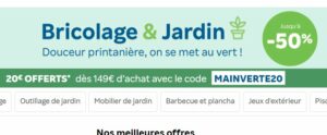 Plusieurs codes de réduction sont actuellement proposés : JARDIN10 donne 10€ de réduction pour 59€ d’achats , JARDIN20 donne 20e pour 149€ d’achat , et JARDIN 100 donne 100€ pour 999€ d’achats