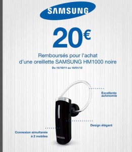 Un bon plan en perspective si vous avez besoin d’une oreillette bluetooth pour votre mobile ou smartphone … Du 15 octobre 2011 au 15 janvier 2012 , samsung rembourse en effet 20 euros pour l’achat d’une oreillette bluetooth SAMSUNG HM1000 NOIRE .