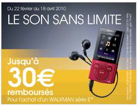 Vous avez envie d’acheter un Walman Audio Video ? L’offre de remboursement différée de Sony est alors susceptible de vous interesser : En effet pour tout achat entre le 22 fevrier et le 18 avril d’un WALKMAN SONY SERIE E ( NWZ-E443B , NWZ-E443R et NWZ-E444B , NWZ-E444R ) beneficiez jusqu’a 30 euros de remboursés