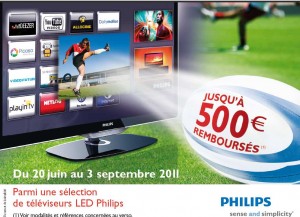 Si vous êtes à la recherche d’un televiseur disposant des dernieres technologies : Led, 200Hz , connecté à internet voire 3D .. profitez de l’offre de remboursement différée de 200 , 400 ou 500 euros proposée par Philips sur plusieurs modèles pour un achat jusqu’au 3 septembre 2011 :