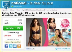 Bientot la Saint Valentin ! Si vous desirez offrir ou vous offrir de la lingerie , profiter de la bonne affaire proposée par le site KGBDEALS ! En effet vous pouvez acheter pour 15 euros un bon d’achat d’une valeur de 45 valable sur le site 1001dessous.com.
