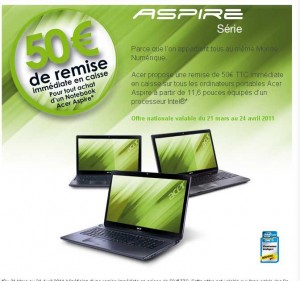 50 euros de remise immédiate sur les pc portable Acer Aspire