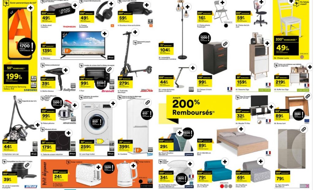 L’offre est tres interessante si on avait prevu d’achat un produit du genre de ceux proposés dans l’operation … par exemple avec 200% il y a notamment un micro onde , une machine à café krups , un aspirateur balai fagor , un fauteuil gamer , une table multi jeux , une lampe , une chaise , un casque , un radio reveil , des écouteurs bluetooth , des parures de draps