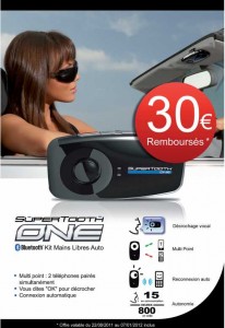 Si vous desirez un kit main libre bluetooth dans votre voiture , il y a une bonne affaire concernant le Supertooth one .. En effet il y a une offre de 30 euros de remboursement différé concernant cet appareil ..