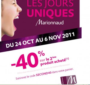 Une offre qui peut etre interessante si vous avez besoin de parfums ou de produits de beautés .. Chez marionnaud (en boutique et sur le site web), du 24/10 au 6 novembre il y a 40% de remise sur le deuxieme article ..