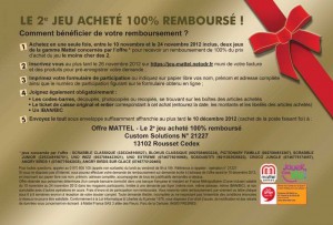 Encore une offre de remboursement concernant des jeux de societes : cette fois ci c’est mattel qui propose pour l’achat simultané de deux jeux, le moins cher remboursé ..