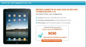 Plus particulierement destiné au possesseurs d’un IPAD 3G (mais utilisable sur avec d’autres tablettes) , le kit de connexion internet 3G prepayé sans engagement de bouygues est gratuit gràce à une offre de remboursement différée à 100% ..