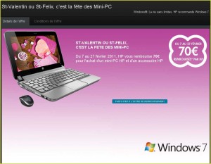 Ainsi pour tout achat d’un netbook HP ( modeles HP Mini 110 ou HP Mini 210 ) et d’un accessoire HP (souris HP, claviers HP, sacoches et housses HP, webcams HP, casques HP, haut-parleurs HP, batteries et alimentations HP) , vous obtiendrez en remboursement différée 70 euros .
