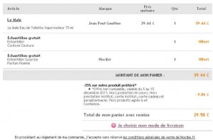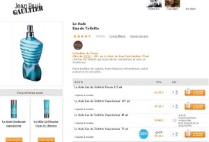 Bon plan pour l‘eau de toilette « Le male » de gaultier en vaporisateur 75ml : le prix du flacon tourne normalement au dela à 45 euros ( 45.3 chez marionnaud , 51 chez sephora , 49 chez nocibe) , mais ce jour 17 decembre, il fait l’objet de 20% de remise immediate chez nocibe .. donc à 39.44 euros …
