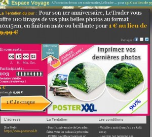 Sur le site letrader est vendu jusqu’au 20 juin , un bon donnant droit à 100 tirages pour 1 euro ( auquel il faudra ajouter 5.99 de port ) au format 10×15 valable sur le site photoxxl soit donc 6.99 euros au total pour les 100 photos .