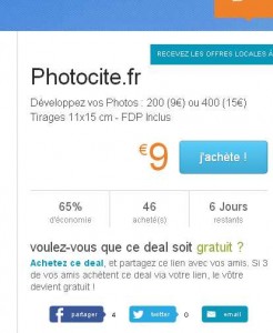 Si vous avez de nombreuses photos à faire developper (ou que vous allez en avoir d’ici la mi juin ), très bonne affaire sur le site living social : en effet on peut acheter pour 9 euros un bon donnant droit au developpement de 200 photos chez photocite . On peut aussi pour 15 euros avoir le developpement de 400 tirages ..