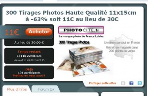 Ceci est possible gràce à une offre proposée jusqu’au 27 septembre sur le site de deals « vie ma ville » . Cette offre propose pour 11 euros un bon d’achat donnant droit au développement de 300 photos via le site photocite (filiale de france loisir)