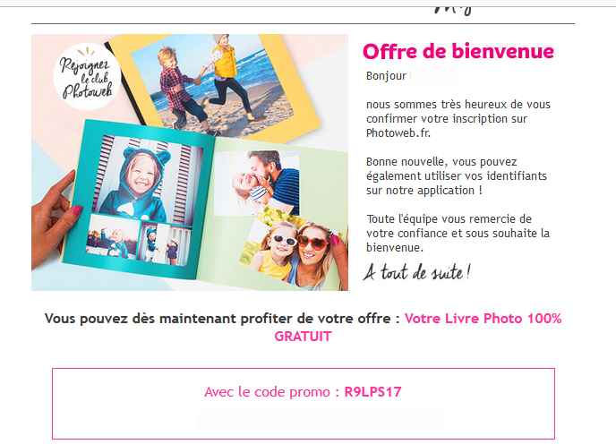 Après avoir indiqué son adresse email , on recoit un message de confirmant le code de réduction pour avoir un livre photo gratuit (ou un livre photo pas cher si on considère qu’il y a les frais de port de 3.99€ à régler )