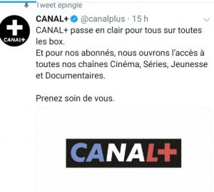 En raison du Coronavirus et du confinement qui va avec , Canalplus annonce qu’il offre gratuitement l’acces à la chaine Canalplus+ sur toutes les box des fournisseurs d’acces et ce jusqu’au 15 avril !