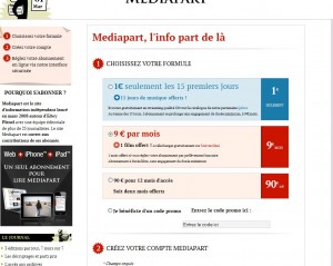 Gratuit , un mois d’abonnement à mediapart : pour cela il faut aller sur la page d’abonnement et choisir la quatrieme option « j’ai un code promo » ..