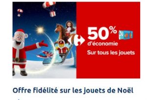 Samedi 28 et dimanche 29 novembre 2020 uniquement, 50% d’économies* créditées sur votre Carte Fidélité sur tous les jouets de Noël disponibles dans l’un de nos supermarchés Carrefour Market et Market (hors Carrefour Drive) situés en France métropolitaine, Corse comprise et participants** à l’opération.