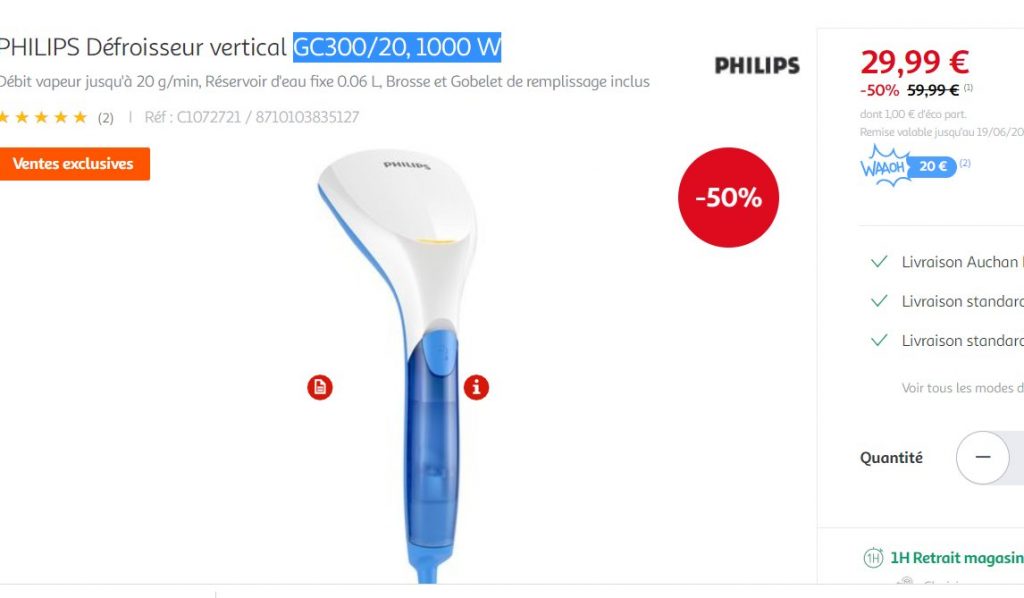 Mega affaire pour un defroisseur vertical de grande marque : le modele GC300/20 de la marque hollandaise qui bénéficie de 2 réductions sur la boutique en ligne Auchan: