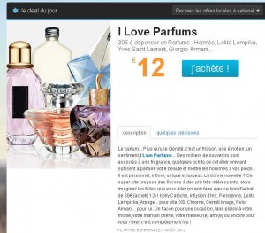 très bon plan parfum : le site iloveparfum propose de nombreuses fragrances à des prix généralement moins élevés que dans les parfumeries de renom : mais en plus actuellement sur livingsocial se trouve en vente pour 12 euros un bon d’achat d’une valeur de 30 utilisable sur ce site soit donc 18 euros de remise ..