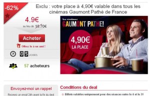Si vous aimez aller au cinema, dans les deals du  site igraal , il est possible d’acheter pour 4 euro 90 des places de cinemas valables dans les gaumont et pathé de France du 4 au 31 janvier , places valables aussi  pour les films en 3D et IMAX  (cependant il n’est pas precisé s’il y aurait un supplement à payer dans ce cas ..).