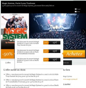 Vous aimez les Magic System ? Vous pouvez aller les voir en concert dans leur tournée des zeniths en payant le billet à moitié prix en profitant de l’offre présente sur lookingo qui propose donc des places pour les concerts de Paris (15 mai 2012) Lyon (11 mai 2012 ) et Toulouse (12 mai 2012 ) à 15 euros ..