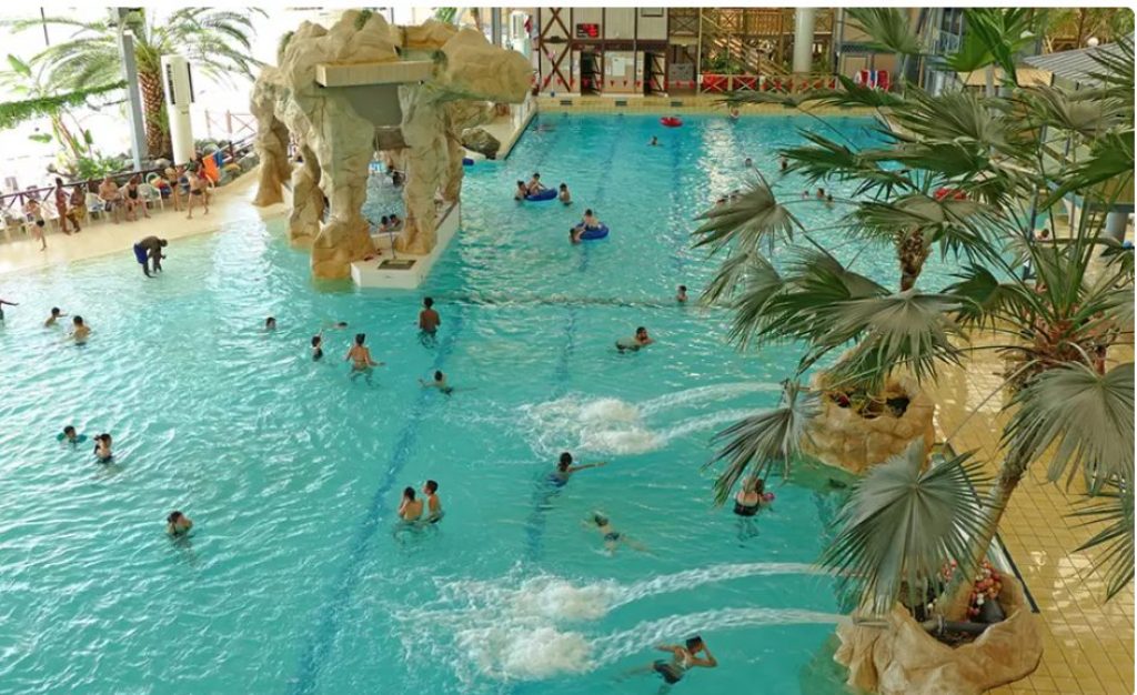 « Les entrées sont offertes à l’espace ludique et son lagon pour tous les occupants d’un appartement, tout leur séjour pour glisser en famille sur le toboggan, défier vagues, cascades et jets d’eau, se détendre dans le bain romain à 35°. »