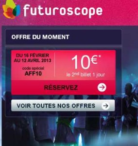 Si vous voulez aller au futuroscope d’ici le 12 avril 2013 , offre interessante sur la billeterie en ligne du parc .. En effet le deuxieme billet daté 1 jour est à 10 euros seulement ..