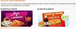 Il peut etre interessant pour vous de vous inscrire gratuitement au club vip de la croissanterie : En effet , apres votre inscription vous pourrez telecharger 2 coupons promotionnels : 1 vous donnant droit pour 1,5 euros à un cafe + 1 croissant et un autre vous donnant pour 3.95 euros à 1 sandwich + 1 boisson