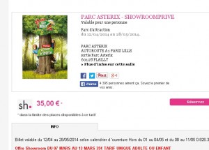 Aller sur showroomprivee pour voir cette vente parc asterix (il faut creer un compte membre si vous n’en n’avez pas .. dans la liste des ventes en cours il faut voir la vente parc asterix )
