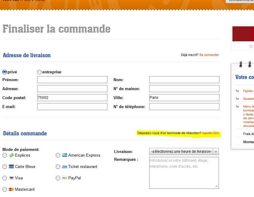 le code est à entrer à l’étape 4 de la commande, dans le champ à côté de « Détails commande », ligne « Disposez-vous d’un code de réduction », juste au dessus du mode de paiement . Le bon est valable jusqu’au 9 octobre 2012 ..