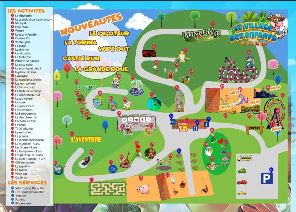 Ce petit parc d’attraction occupe une superfice de 4 hectares .On trouvera au village des enfants de nombreuses activités telles que structures gonflables, des trampolines, une grande roue , une mini ferme , un mini golf , des jeux d’eaux