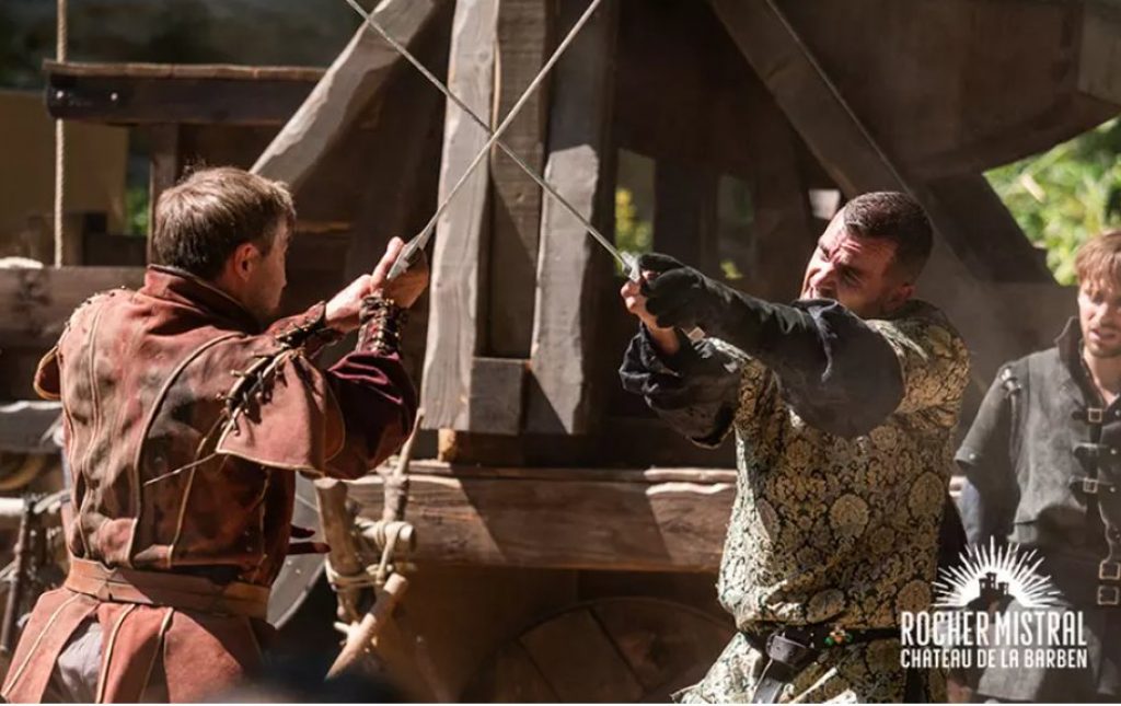 Le Spectacle principal de jour, c’est « à double tranchant » .. un spectacle de cascade , de combats qui dure 25 minutes et qui raconte l’histoire du seigneur revenant de croisade et qui doit reconquerir ses biens …