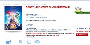 Si vous comptez aller à disneyland paris d’ici le mois de novembre 2013 , il y a une vente flash susceptible de vous interesser sur la billeterie carrefour : il y a des billets 1 jour/2parcs à acheter donc à : 44.40 euros par adulte et 39.6 euros par enfant ..