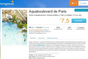 Pour les parisiens et franciliens, si vous aimez aller à Aquaboulevard, une offre qui vous interessera sur le site living social : en effet le billet enfant est à 7.5 euros au lieu de 15 et les billets adultes sont à 11 (semaine au lieu de 22) ou 14 euros (week end au lieu de 28 ) …