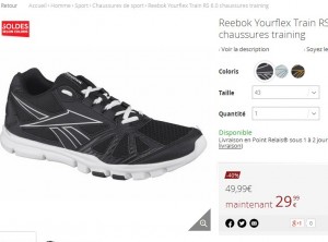 les Reebok Yourflex Train RS 6.0 sont en soldes à 29.99 euros au lieu de 50 euros sur le site des 3 suisses ..