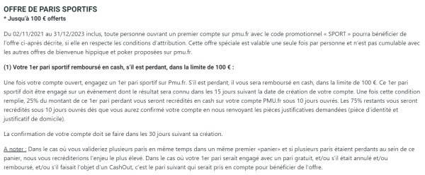 - Votre 1er pari sportif remboursé en cash, s’il est perdant, dans la limite de 100 € :Une fois votre compte ouvert, engagez un 1er pari sportif sur PMU.fr sur un évènement dont le résultat sera connu au plus tard dans les 15 jours suivant la date de création de votre compte.Si ce premier pari (non annulé, non remboursé et répondant aux critères d’éligibilité ci-dessous) est perdant, l’enjeu engagé vous sera remboursé en cash, dans la limite de 100€.